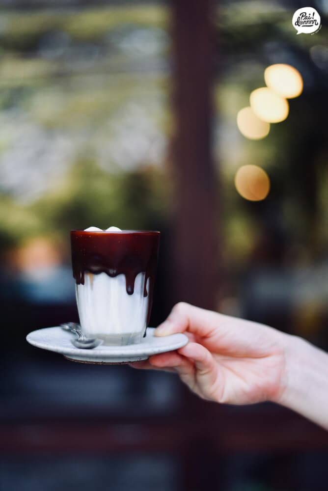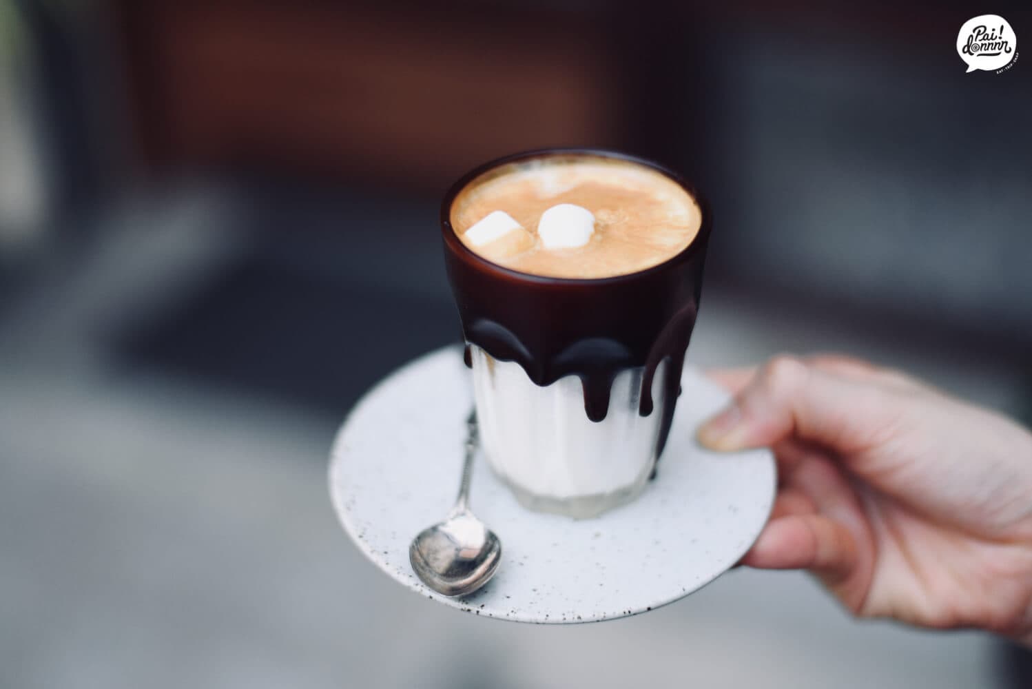 Dirty latte แก้วด้านนอก dip ด้วย chocolate ด้านในเป็นลาเต้ และมีมาร์ชแมลโล่ว
