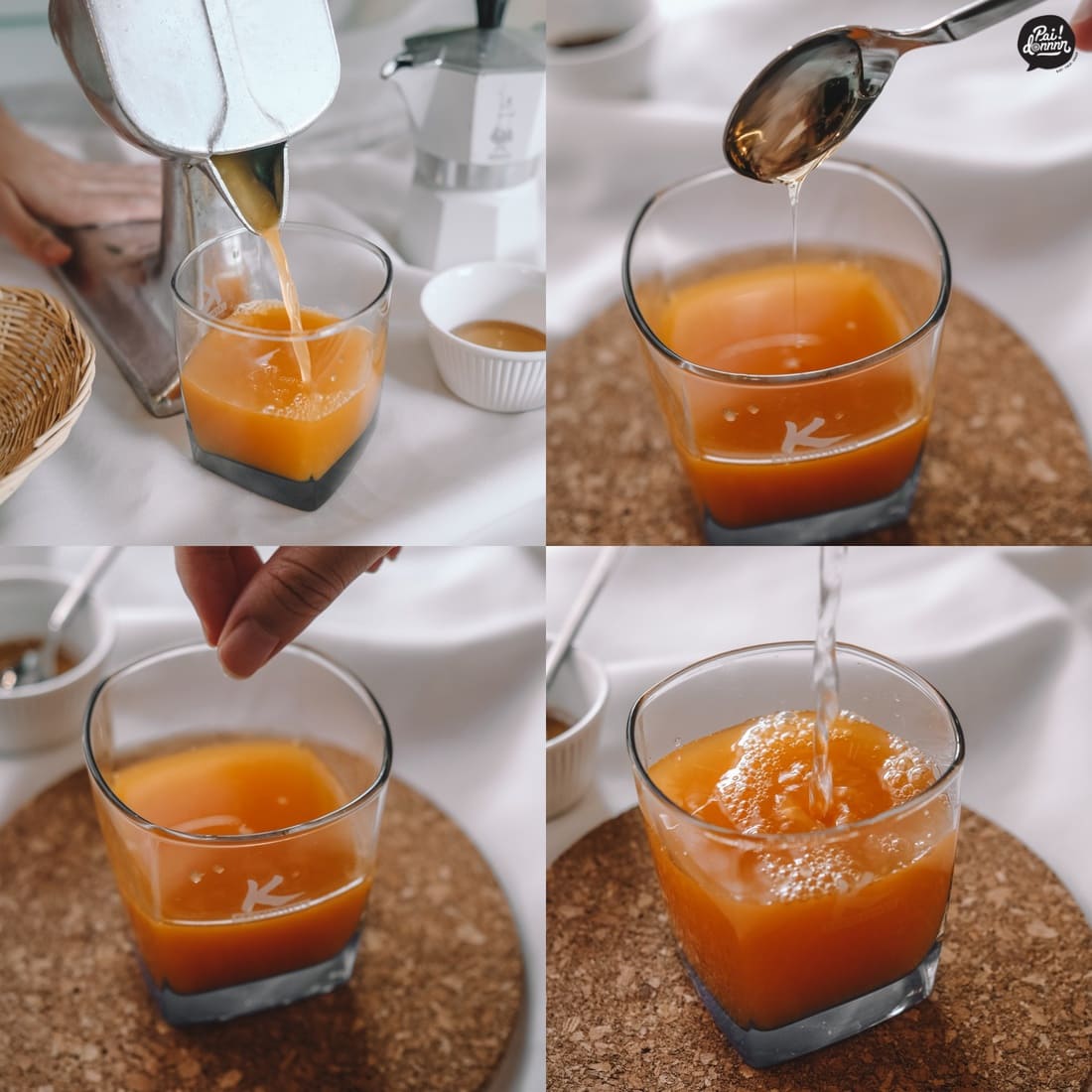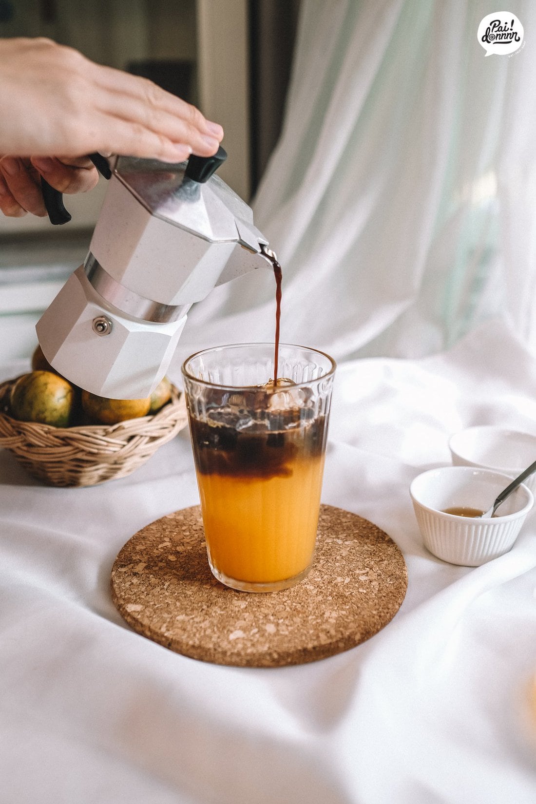 5.เทน้ำส้มลงในแก้วก่อน ตามด้วยกาแฟ แนะนำว่าค่อยๆเทนะ เค้าจะแยกชั้นกันเองเลย ถ้าไม่มีที่เทให้เป็นสายเล็กๆ เราแนะนำให้เอาช้อนกินข้าวมารอง แล้วเทใส่ช้อน สายกาแฟจะได้ไม่แรงมาก