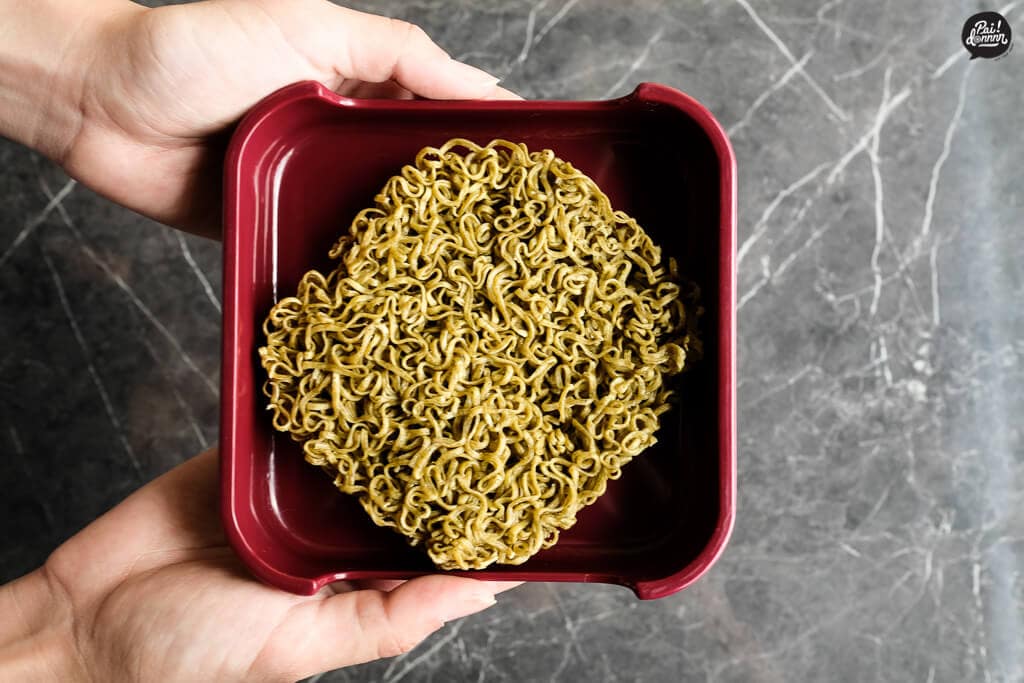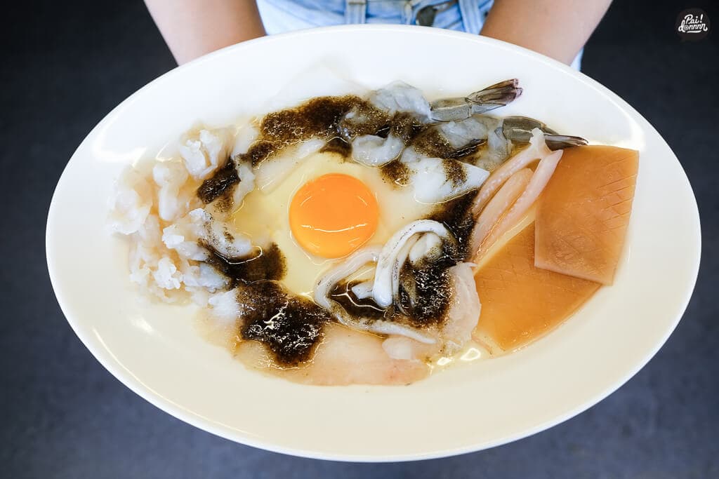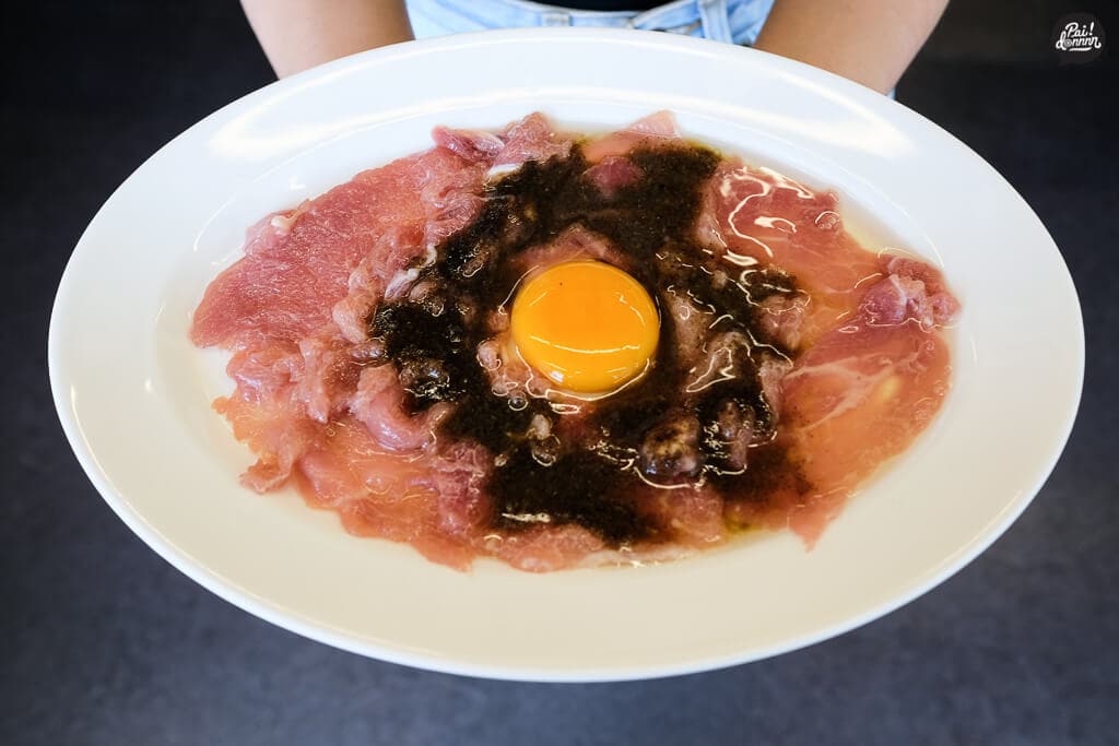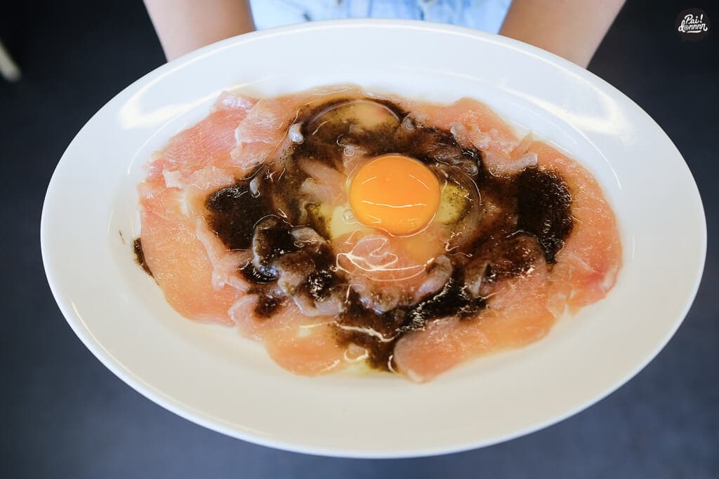 เสิร์ฟมาพร้อมกับซอสเต้าเจี้ยวสูตรพิเศษของทางร้านและไข่ไก่ (ถ้าเป็นเนื้อจะใช้ไข่เป็ด)