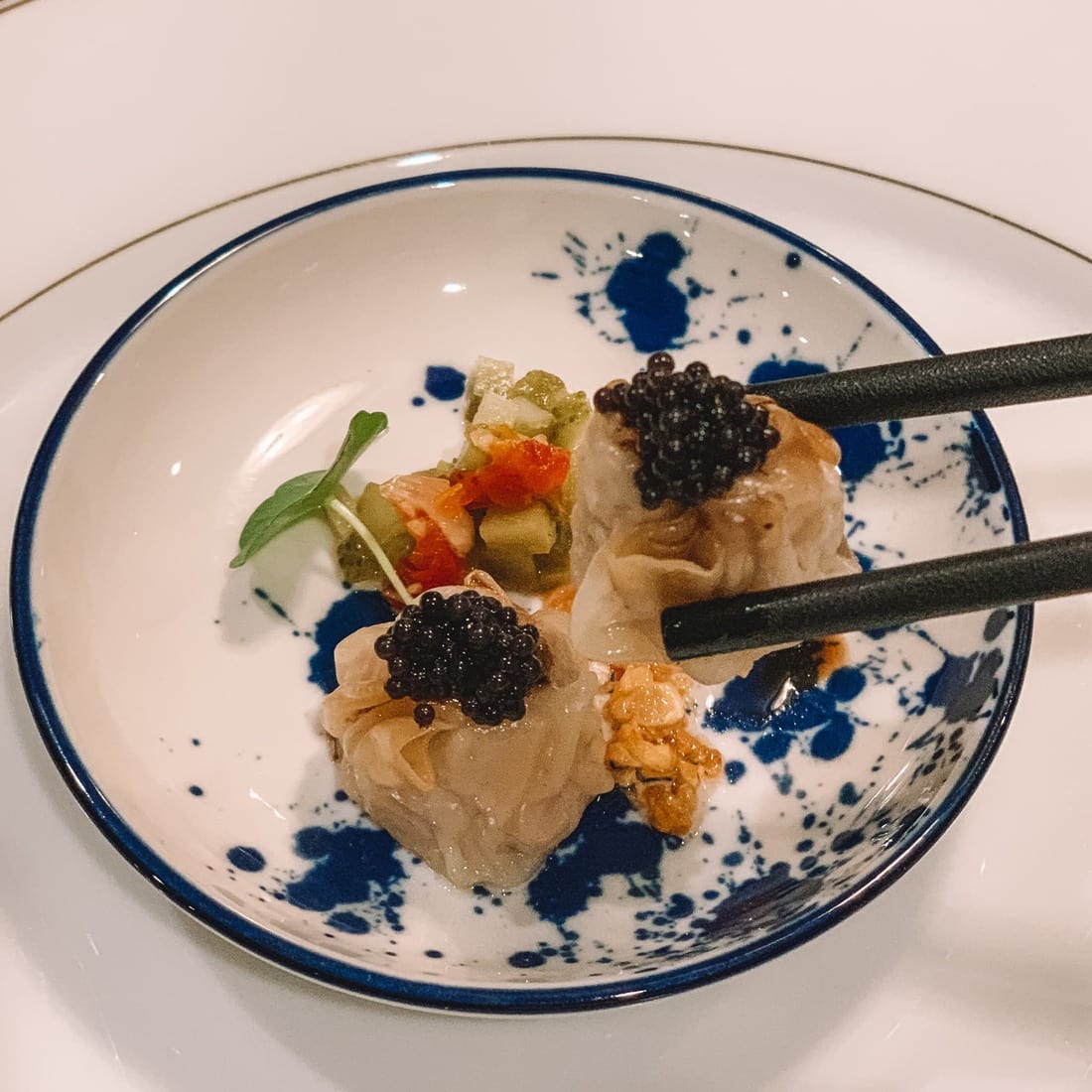 ขนมจีบหมูที่โปะคาเวียร์ไว้ด้านบน โรยกระเทียมนิดๆ พร้อมเครื่องเคียง เป็นเมนูเรียกน้ำย่อยเมนูแรกของวันนี้ ตัวขนมจีบอาจจะยังเฉยๆนะ แต่รออ่านเมนูต่อไป อย่าพลาด