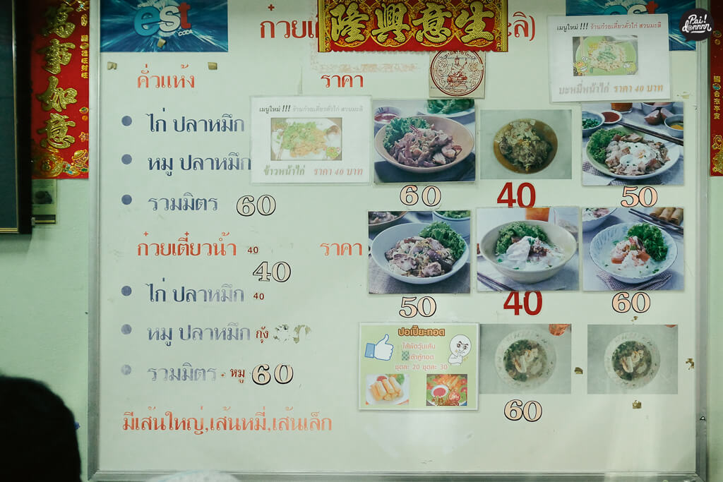 เมนูทุกๆร้านคล้ายกัน คั่วไก่ คั่วอบ เกาเหลา (แบบไม่มีเส้น คล้ายไข่เจียว) หนังไก่ ก๋วยเตี๋ยวไก่