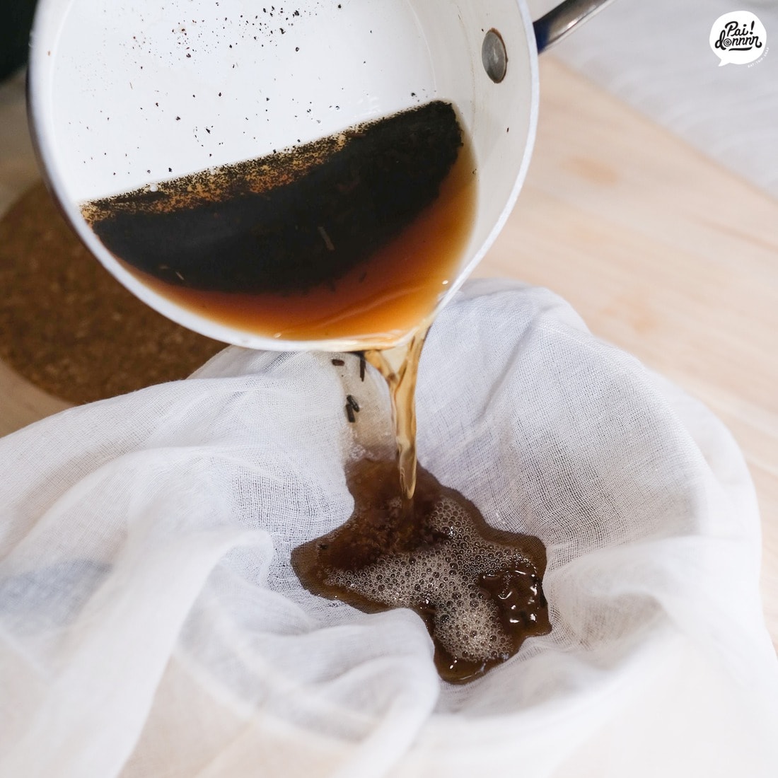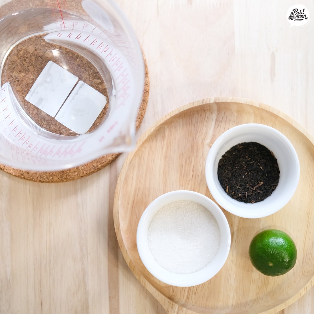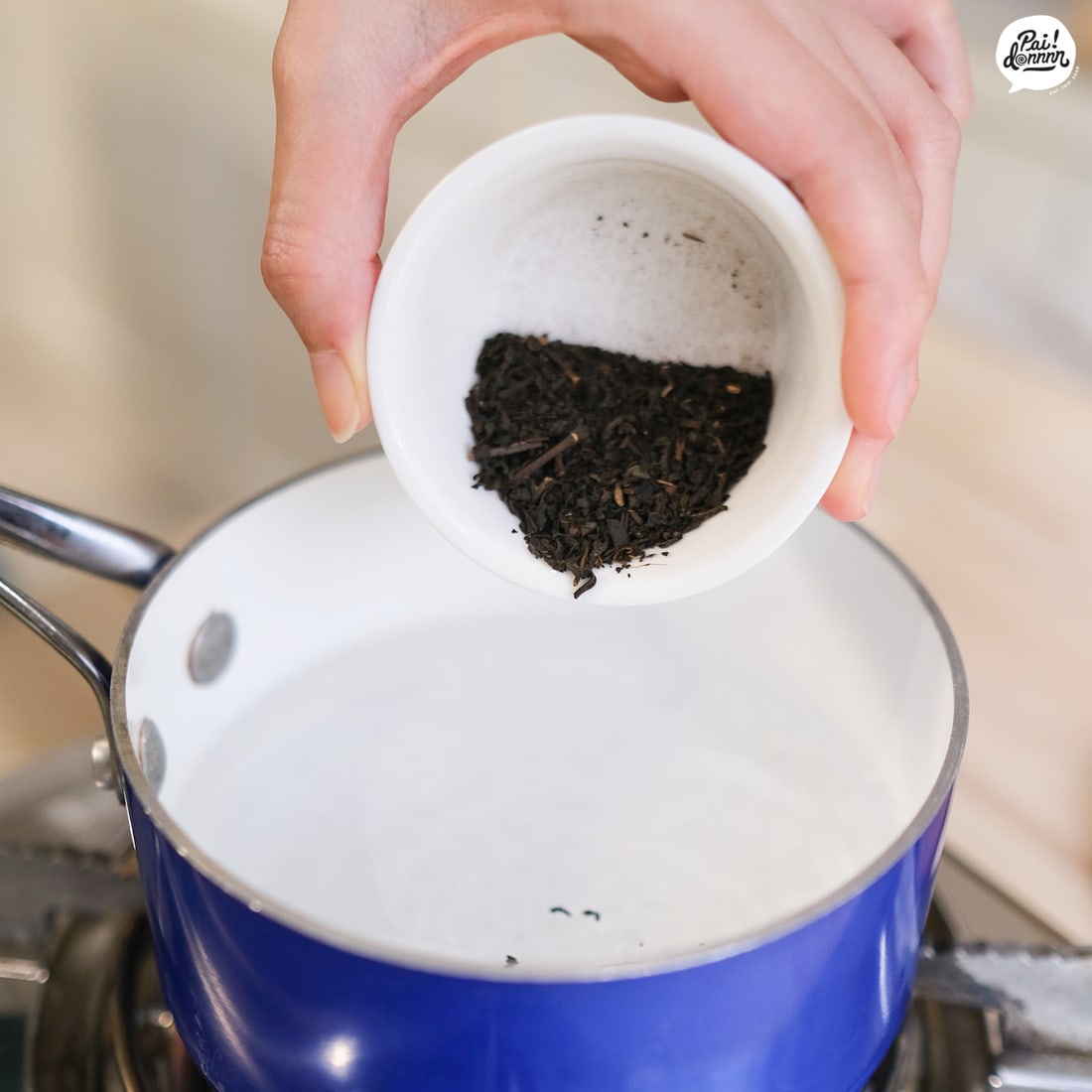 1.ผสมน้ำ 250 ml กับใบชาและน้ำตาล ต้มจนน้ำตาลละลาย
