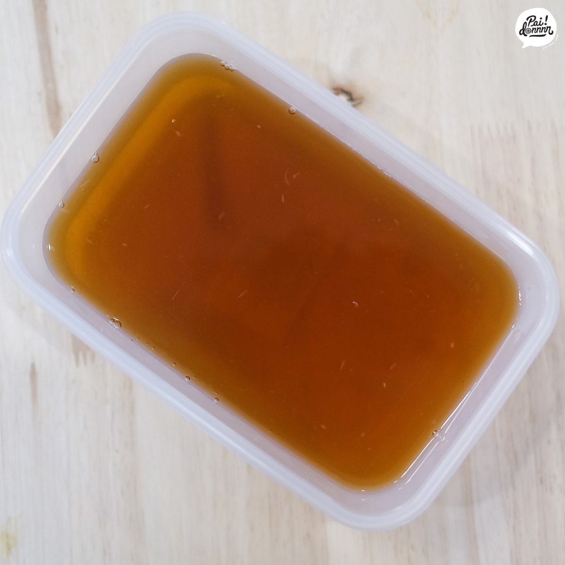 4.บีบมะนาวลงไปและชิมรสชาติ เปรี้ยวมากน้อยตามชอบ และเทใส่กล่อง พักให้เย็นที่อุณหภูมิห้อง ปิดฝา แช่ฟรีช