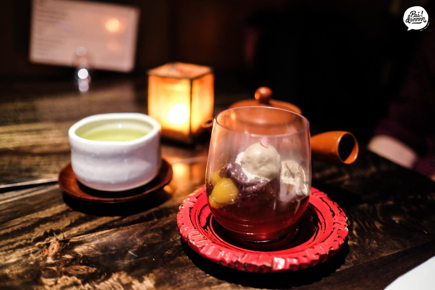 อีกถ้วยสั่ง Hojicha Anmitsu เป็นเจลลี่โฮจิฉะ ราดน้ำเชื่อม เสิร์ฟกับ shiratama รสมอคค่า และไอศกรีมโฮจิฉะ ถ้วยนี้อร่อยยย