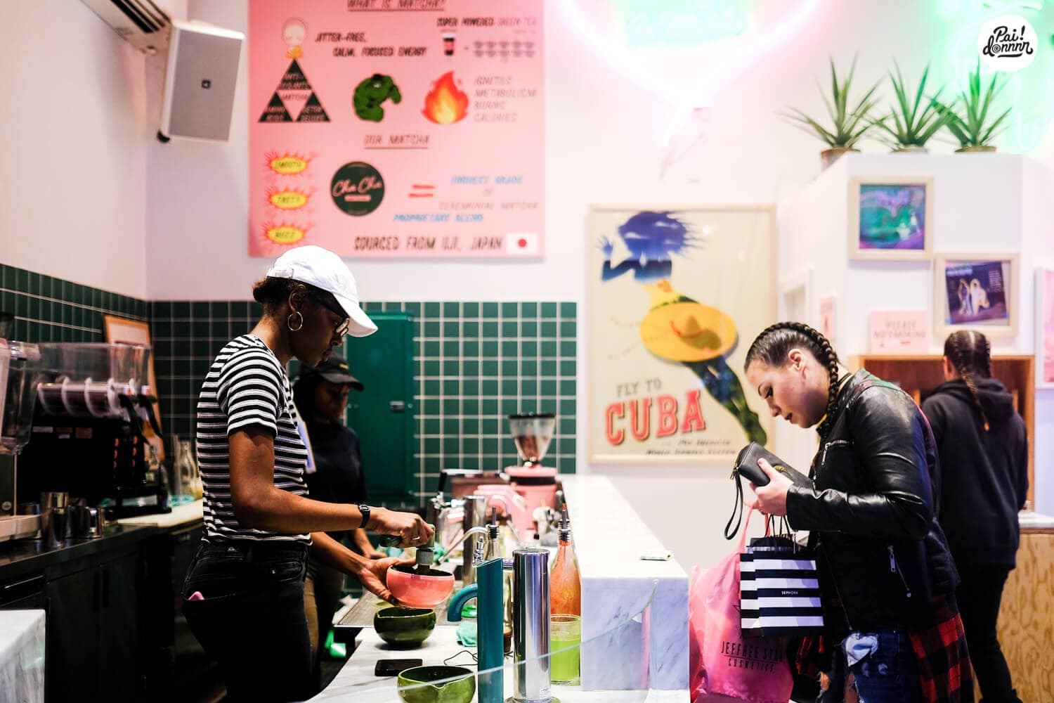 เดินผ่านแล้วสะดุดตากับโทนสีและการแต่งร้านมาก ชมพูเขียวมีความ tropical จนต้องหยุดดูว่าคืออะไร