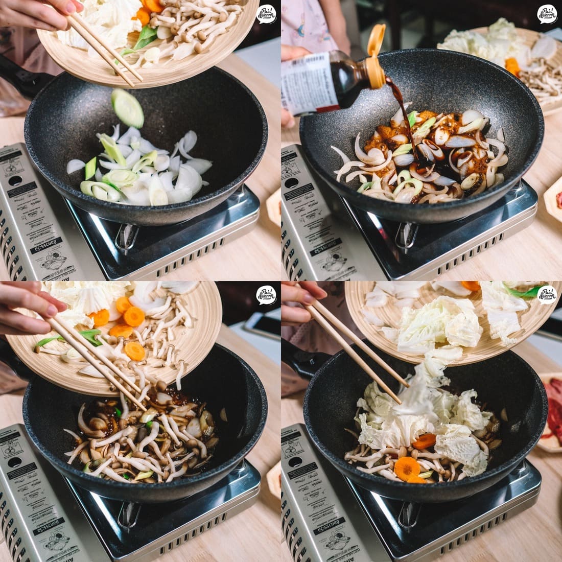 2.เติมน้ำซอสสุกี้ยากี้แบบยังไม่เจือจางลงไป รอสักครู่ให้งวดๆ เติมผักที่เหลือลงไป เราใช้ผักกาดขาว แครอท เห็ด