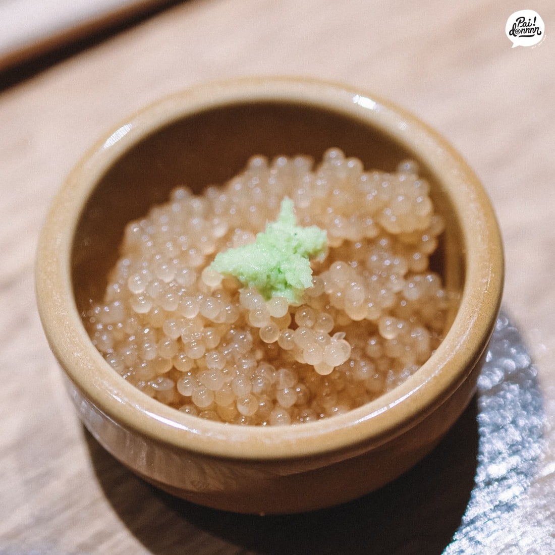 คำนี้เสิร์ฟปลาไหลตัวอ่อน (ไม่แน่ใจว่าเป็นพันธุ์ไหน แต่มันตัวใสๆเลย) โปะด้วย Ikura เสิร์ฟในซุปดาชิ โปะทองเพิ่มความหรูด้วยทองคำด้านบน