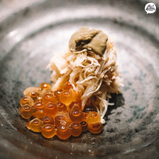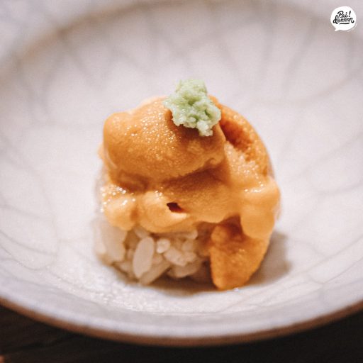 เริ่มต้นที่คำแรก เป็น Appetizer พอดีคำ ด้านล่างเป็น ไข่แดงครีม ตามด้วย Squid Bafun Uni และใบชิโสะ