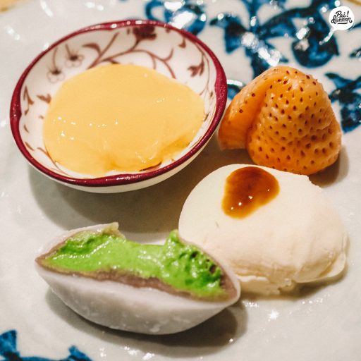 ปิดท้ายค่ำคืนนี้ด้วยขนมหวาน Mochi / vanilla ice cream/ strawberry/passion fruit jelly