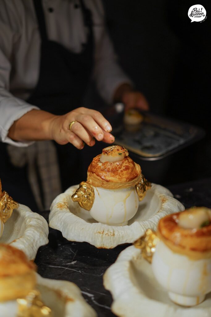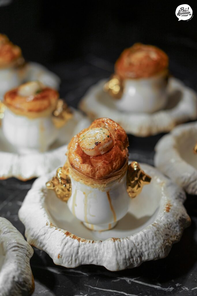 เมนูซุปคลาสสิกที่ได้แรงบันดาลใจจากเชฟ Paul Bocuse เนื่องจากสมัยก่อนไม่มีหม้อแรงดัน เลยใช้การเอาแป้งพัฟฟ์มาปิดฝาถ้วยไว้แล้วอบ แรงดันจากในถ้วยก็จะดันให้แป้งฟูขึ้นมานั่นเอง ซุปเห็ดใช้เห็ดทั้งหมด 4 ชนิดด้วยกันคือ เห็ดทรัฟเฟิล เห็ดมอร์เรล เห็ดชองเทอเรล และพอร์ชีนี ด้านบนมี sear scallop ที่ยังไม่สุกดี วิธีการทานคือให้เจาะแล้วแช่ scallop ไว้ในซุป 1 นาทีเพื่อให้สุกพอดี เห็ดกลิ่นชัดเจนมากและมีเนื้อเห็ดมอร์เรลด้วย scallop หวานอร่อยมาก เข้ากับซุปและแป้งพัฟฟ์ได้ดี